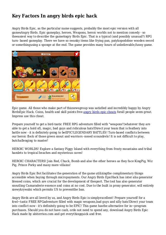 Angry Birds Epic Rpg Hack – How it works All you need to do is click on Angry Birds Epic Rpg Hack for the hack to work Here we show you a step by step guide on how to make it work Click ‘Online Hack’ Go to the website hack;. Angry birds epic hack New Latest Version (Auto Update Working Version) Undetectable, Safe and Effective (100% Guaranteed) No ROOT or NO DOWNLOAD needed Updated daily to Daily updates to certify the working hacks. The worldfamous "Angry Birds" are ready to take on the world in a mobile RPG Use these top 10 tips/tricks/cheats to lay waste to the pigs in your way.