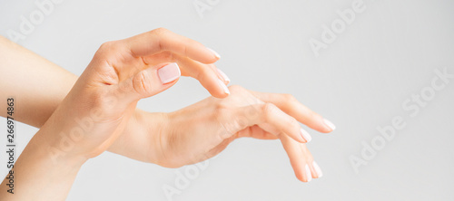 Close Up Of Women S Hands With Gentle Nude French Nails Manicure On A Light Background With Space For Text Long Wide Banner Buy This Stock Photo And Explore Similar Images At Adobe