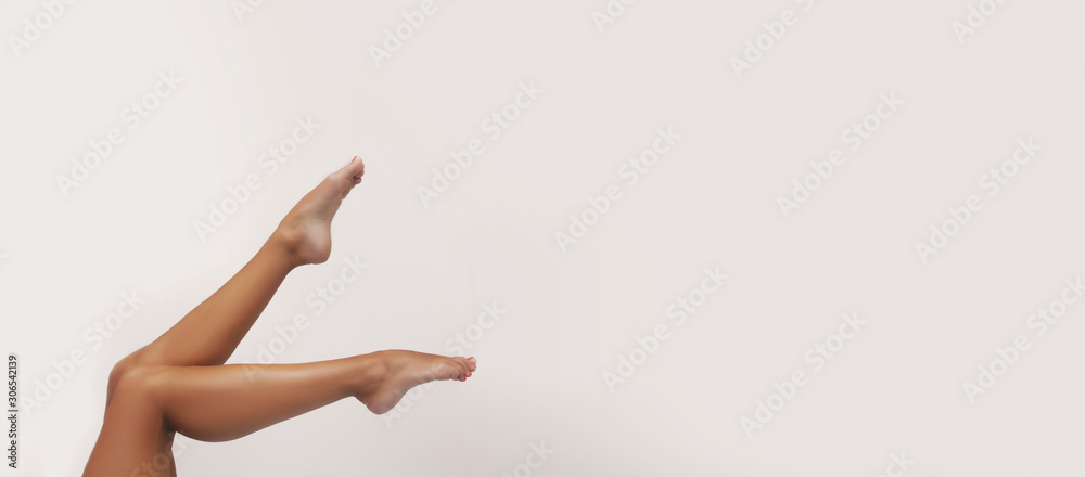 Woman Body Care Close Up Of Long Female Tanned Legs With Perfect Smooth Soft Skin Pedicure Healthy Nails Isolated Epilation Beauty And Health Concept Free Space For Text Panoramic Banner Stock