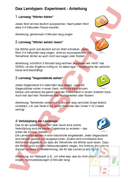 LerntypenTest Wie lernt Ihr Kind am besten?. Der visuelle Lerntyp muss die Dinge sehen, um sie zu besser zu verstehen, Texte spielen hier eher eine untergeordnete Rolle Der visuelle Lerner benötigt Bilder, Diagramme, Grafiken oder auch Videos, um Sachverhalte schneller zu verstehen. Weiters benötigst du eine Stoppuhr, einen Stift, ein Arbeitsblatt und ein leeres Blatt für jede Testperson Das Arbeitsblatt hat folgendes Aussehen Übung Behaltene Begriffe Anzahl der richtigen Begriffe 1 Übung akustisch 2 Übung optisch 3 Übung motorisch 4 Übung haptisch Das Experiment besteht aus vier Übungen.