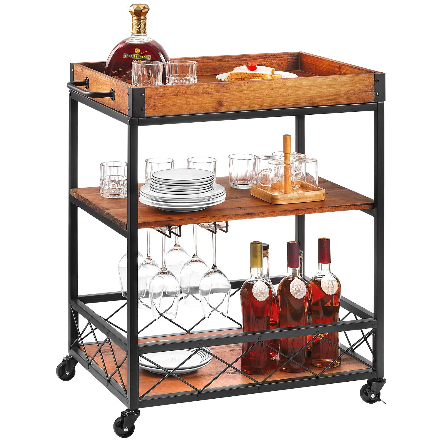 Kealive Kitchen Bar Cart For Home With Removable Wood Box Container Mobile Metal Wine Cart On Wheels With Handle Rack Glass Holder Rustic Serving Cart 3 Tier Storage Vintage Brown 26l X 18w