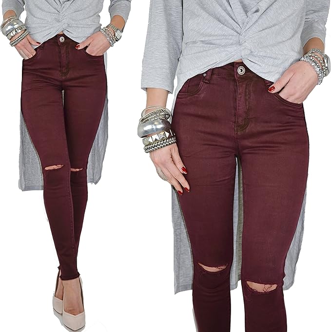 Sexy Weinrote High Waist Risse An Knien Denim Hose Ripped Gr Xs S M L Xl 171 L Amazon De Bekleidung