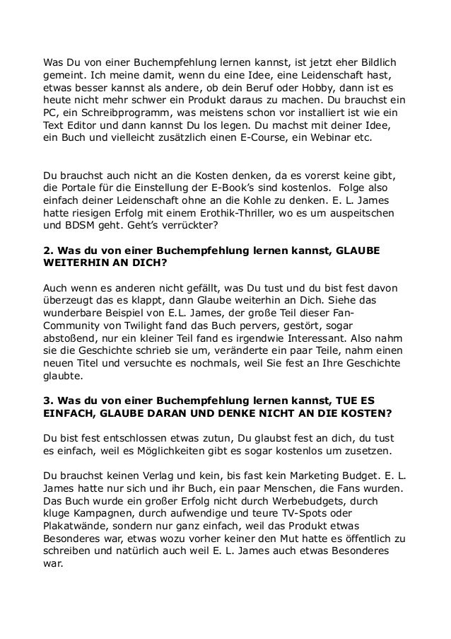 Beispielbriefe auf Deutsch Erfolgreiche Geschäftskorrespondenz Schreiben Sie oft aus geschäftlichem Anlass Briefe und EMails auf Deutsch?. Eine Buchempfehlung zu schreiben, ist eine häufige Aufgabe in Klausuren und anderen Prüfungen Auch wenn es sich dabei nicht unbedingt um ein leichtes Unterfangen handelt, kann es doch auch eine Menge Spaß machen Das Wichtigste beim Schreiben einer Buchempfehlung ist, dass Sie glaubwürdig und überzeugend auf den Leser wirkt. Wenn Sie eine Empfehlung schreiben müssen, dann müssen Sie einen Text schreiben, der ü im Präsens (= Gegenwart) verfasst ist ü ein Urteil enthält, das nach dem BBBSchema (Behauptung, Begründung, Beispiel) aufgebaut ist ü sich an die Adressaten und Adressatinnen richtet ü klar und strukturiert aufgebaut ist ü den InputText aufgreift bzw klar das Thema bespricht.