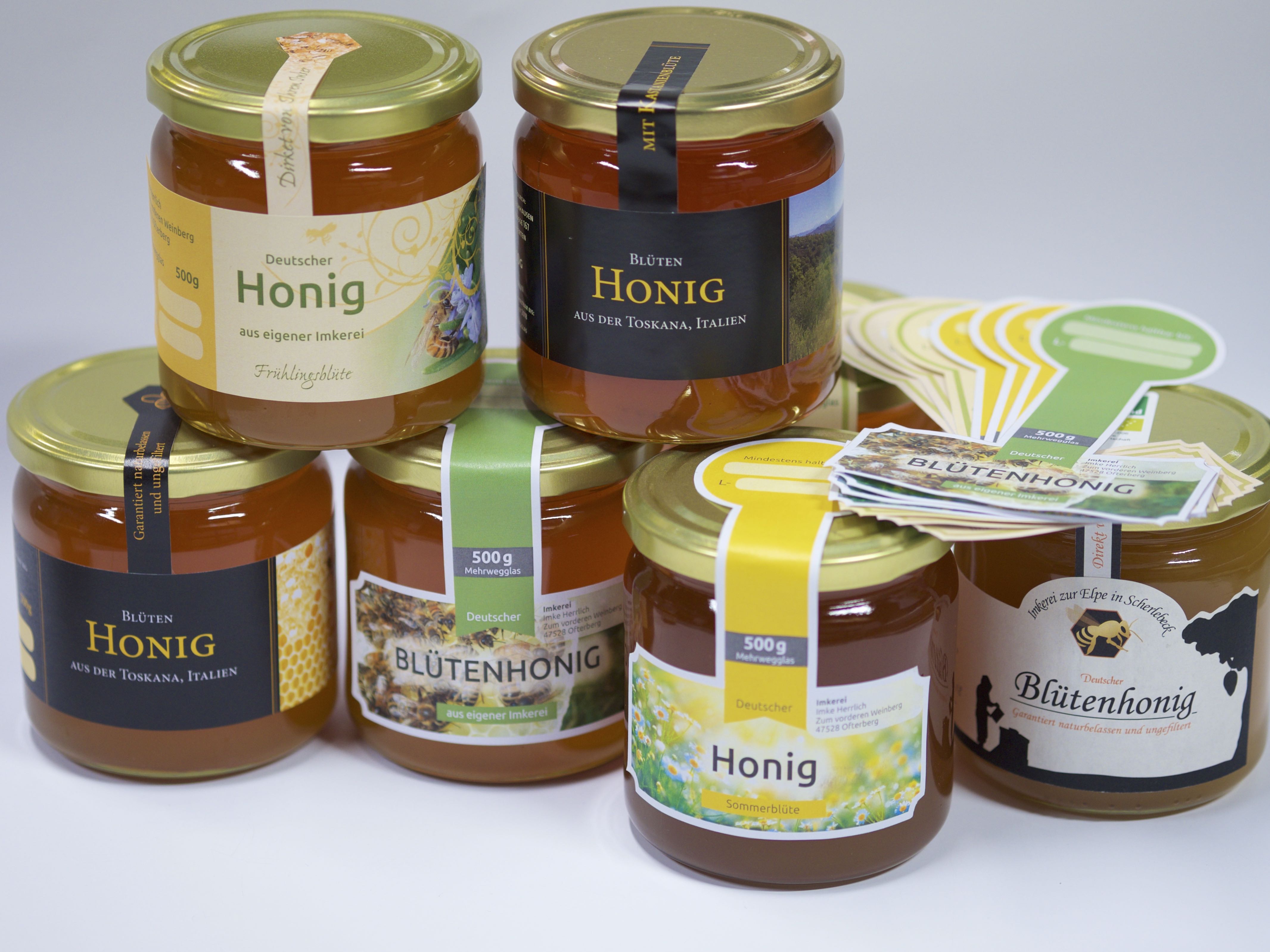 Werfen Sie einen Blick auf unsere Materialauswahl und die verschiedenen Veredelungen, die Ihnen für Ihr Honigetikett zur Verfügung stehenOder bestellen Sie sich einfach unser praktisches Materialmusterbuch mit zahlreichen Mustern selbstklebender Etiketten, gedruckt auf unseren Standardmaterialien Überzeugen Sie sich selbst von unserer Druckqualität und lassen Sie sich von den. Honigetiketten drucken lassen Honig mit Stil, mit Ihren eigenen Etiketten Druck auf Qualitätspapier inkl 4/0farbiger Digitaldruck Konturenschnitt Individuelle Etiketten für Honiggläser Pflichtangaben nicht vergessen!. Besonders beliebt sind dabei unsere ablösbaren Etiketten (ablösbare Kleber) oder Etiketten mit WLA Kleber Diese lassen sich rückstandlos beim Waschen mit alkalischen Lösungen wieder entfernen Sie produzieren verschiedene Sorten Honig?.
