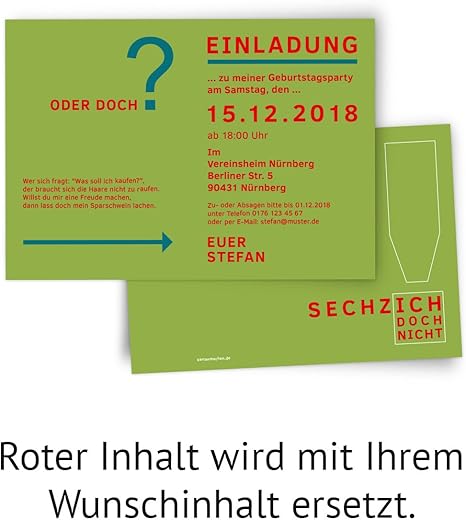 And thousands of other words You can complete the translation of spinn doch nicht!. Runder Geburtstag 60 Jahre Einladungen SechzICH DOCH NICHT Format Klappkarte DIN A6 (geschlossen 105 x 148 mm, offen 210 x 148 mm) Material Papier 300g/qm Inkl Druck Ihrer Texte Passende Briefumschläge DIN C6 (162 x 114 mm) Umschläge sind nicht Teil des Lieferumfangs und müssen separat bestellt werden. #dsgvo #kaipflaume jetzt neu Mega Testpaket http//bitly/GTD_Testpaket!!!!!.