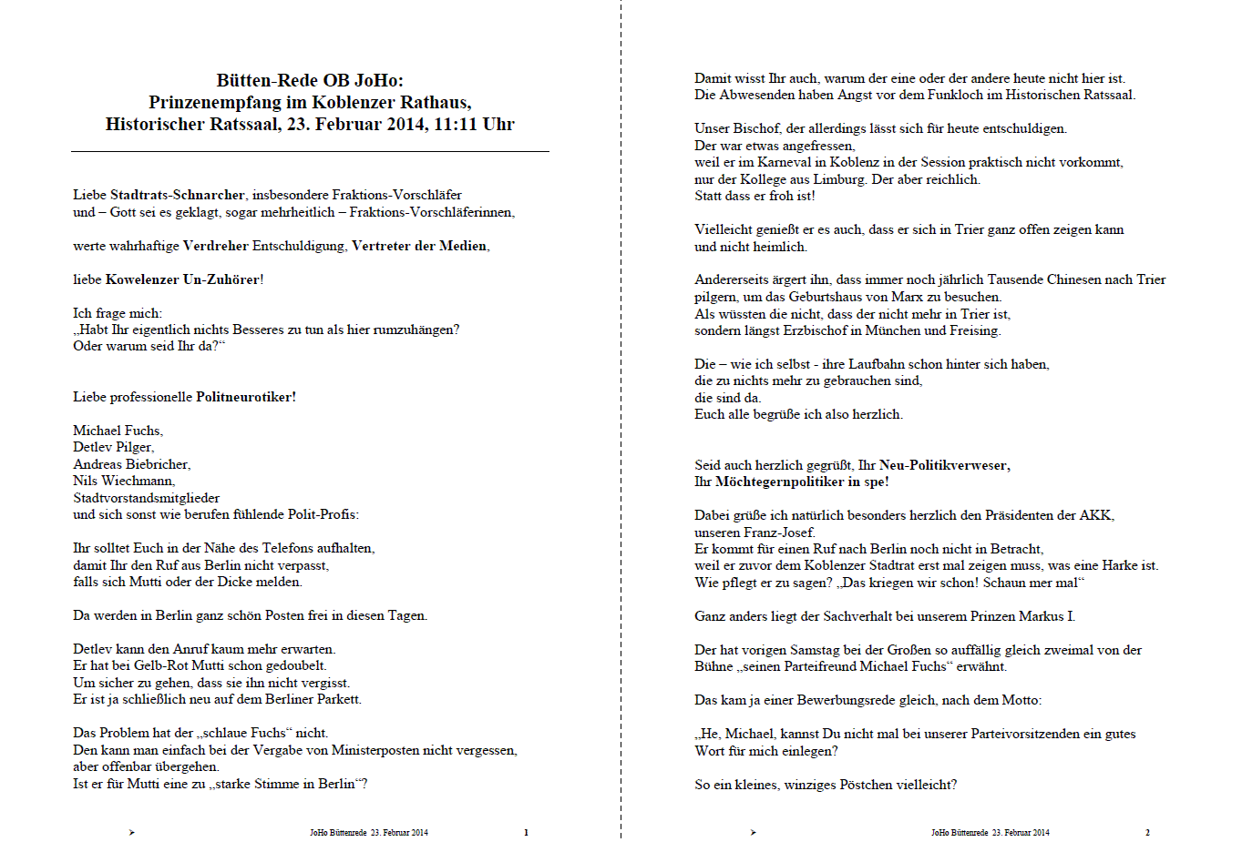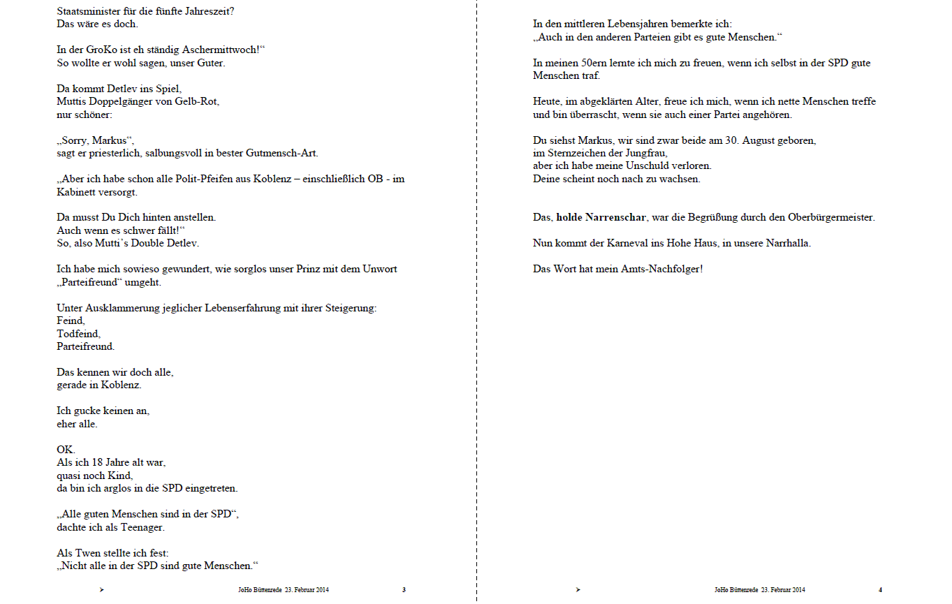 Ganz egal isch bin noch fit, mache fast noch alles mit Mer is so jung, wie mer sisch fühlt, denn des Herz is uffgewühlt !. Büttenrede D Büttenrede Angeblich wurde diese Büttenrede 1995 in der Karnevalshochburg Flörsheim am Main gehalten Der Redner musste nach dem Vortrag unter Polizeischutz rausgebracht werden und die Sitzung wurde vorzeitig beendet, aber die Rede ist seitdem Kult!. Büttenrede Tim & Björn 05, Zwiegespräch Zur Rede im PDFFormat Alle Reden Einzelreden Zwiegespräche & Gruppen Hinweis Meine HumorSeiten sollten nicht so ganz ernst genommen werden Sie haben nicht zum Ziel, irgendjemanden zu beleidigen, gegen bestimmte Personengruppen aufzuhetzen oder zu einer politischen Meinungsbildung beizutragen.