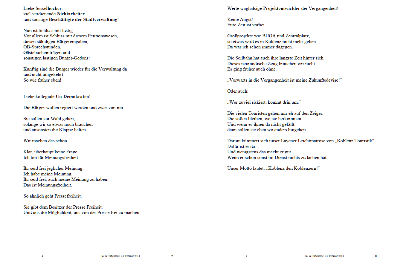 Die zentrale Botschaft der beiden Rebbes an die französischen Juden Macht keine 'Aliyah' nach 'Israel' Rettet Eure Kinder vorm Zionismus und bleibt hier!. Büttenrede für eine kräftige (mollige) Frau im Frankfurter Dialekt Autor Manfred Böhner Ich grüß euch all, bin deprimiert ich bin’s die Lisabeth Ich war vor zwaa Jahr schomma hier, bin sexy und adrett!. Via eines katholischen Internetmagazins erfahren wir, der Kardinal Lehmann sei mit dem Papst Aufzug gefahren, finde ich nett, wobei ich bislang nicht wusste, dass das soooooo außergewöhnlich ist, ging ich doch davon aus, dass Papst und Regierungsmannschaft, welche ja die Kardinäle sind, schon öfter was miteinander zu tun haben und sich kennen.