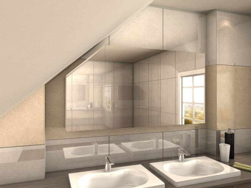 Dann entscheiden Sie sich doch für einen Spiegelschrank für Dachschräge Spiegel für Dachschrägen gibt es selbstverständlich auch mit Beleuchtung Satinierte Flächen mit individuellem Muster, die von sparsamen LED hinterleuchtet werden, machen einen solchen Badspiegel mit Schräge zu einem echten Stilelement im Badezimmer. Bad unter Dachschräge, Entwurf Stauraum im Bad, wie bekomme ich das sinnvoll hin?. Die Schräge beeinflusst Ihre Möglichkeiten, doch unsere individuelle Anfertigung löst dieses Problem Wir sorgen dafür, dass sich der Badezimmerspiegel präzise unter die Schräge einfügt Um den Spiegel für Dachschrägen passgenau herstellen zu können, geben Sie die Höhe links und rechts ein sowie die Breite unten und oben.