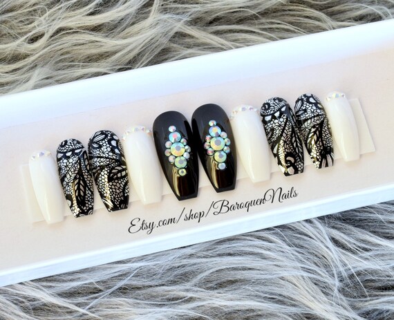 Honeymoon Lace Nails Black White Press On Nails See Through Etsy