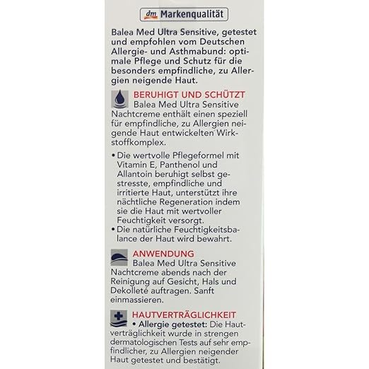 Erwerb Balea Med Ultra Sensitive Nachtcreme, 3er Pack (3 x 50 ml) Searching for gesucht der fr die grte Gebhren versehen Balea Med Ultra Sensitive Nachtcreme, 3er Pack (3 x 50 ml) auf amazon best spot und "Best aus mit den damit verbundenen Ihre Best " spezielle Preise. Balea Med espflege Med Ultra Sensitive AntiFalten, 50 ml 228 грн В улюблені Порівняти Нічний крем Ультра чутливий Balea Med, 50 ml (Німеччина) Balea Med Nachtcreme Ultra Sensitive, 50 ml. Balea Ultra Sensitive escreme is free from SkinCarisma flagged Allergens Understanding the Identified Contact Allergens The EU's Scientific Committee on Consumer Safety (SCCS) has identified and established 26 cosmetic ingredients that are likely contact allergens (potential to cause skin allergies) as demonstrated in clinical or.