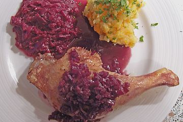 Entenkeulen Mit Rotkohl Apfelschuppen Und Rosti Chefkoch Schrats Rezept